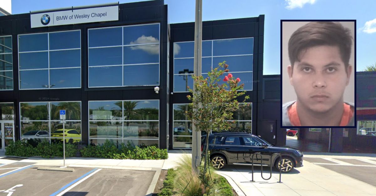 Inset: Juanniel Luque Cantillo (Pasco County Jail). Background: BMW of Wesley Chapel in Florida (Google Maps).