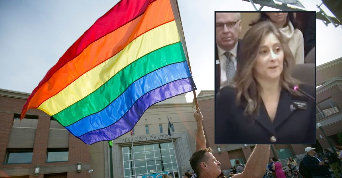 Background: Carmine Caruso holds a rainbow flag during a rally in supports of same sex marriage in front of the Ada County courthouse in Boise, Idaho, on Friday, May 16, 2014 (AP Photo/The Idaho Statesman, Kyle Green). Inset: Idaho Republican Rep. Heather Scott introduces a cannibalism bill on Feb. 8, 2024 (KTVB/YouTube).