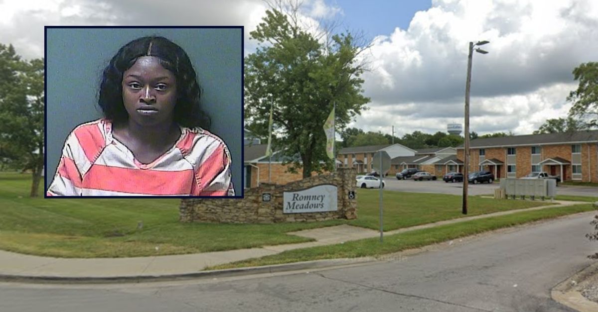 Inset: Shatia Welch (La Porte County Jail). Background: The apartment complex where Welch’s 1-year-old was killed by his 5-year-old brother (Google Maps).
