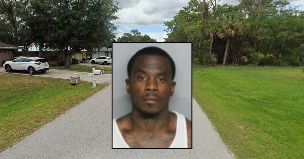 Inset: Jonathan Webster (Charlotte County Sheriff’s Office). Background: The area near Arrow Street and Emerald Avenue where Jonathan Webster allegedly attacked a pregnant woman (Google Maps).