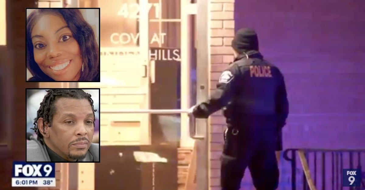Background: The apartment complex where Johnny Brown killed his girlfriend Kesha Moore in Minneapolis, Minn. on Dec. 17, 2023 (KMSP/YouTube). Inset top: Kesha Moore (Violence Free Minnesota/Facebook). Inset bottom: Johnny Brown (KSTP/YouTube).