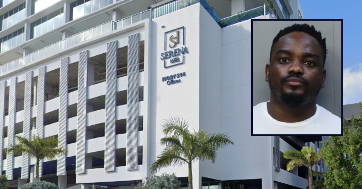 Inset: Elmoncy Sercle (Miami-Dade Department of Corrections and Rehabilitation). Background: Serena Hotel in Aventura, Florida (Google Maps).