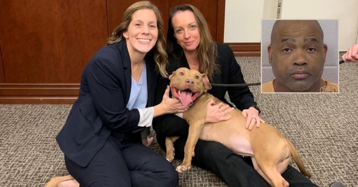 Inset: Vincent Lemark Burrell (Paulding County Sheriff’s Office). Background: Officials brought one of the victim dogs, Baby Shark, to Burrell’s sentencing (WXIA).