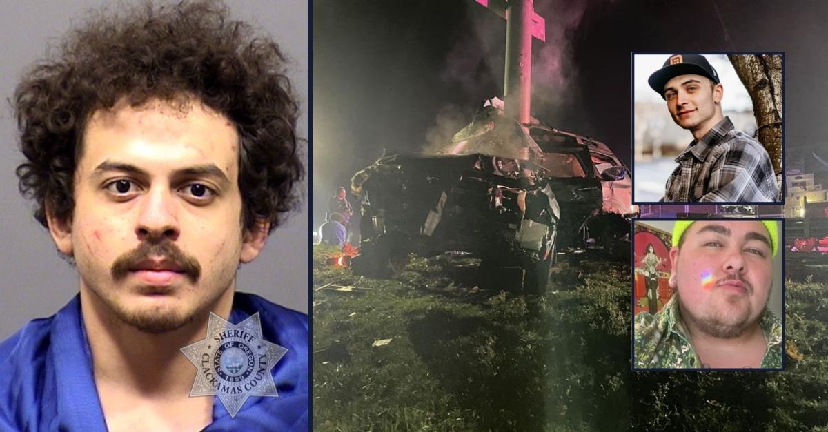Background, left to right: Fullington William Frazer III, the site of the crash that killed two people (Clackamas County Prosecutor’s Office). Insets, top to bottom: Mitchell Scott Barr, Fleetwood Mars Mozee (GoFundMe).