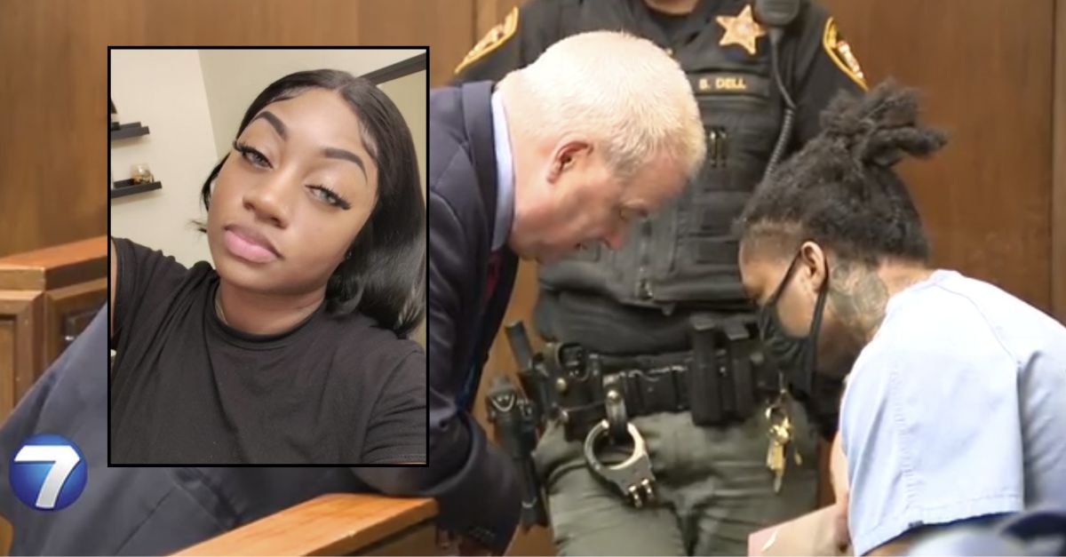 Background: News footage of Tony Jackson (in mask) in court for his sentencing on Sept. 16 (WHIO). Inset: Matyka Brown (H.H. Roberts Mortuary).