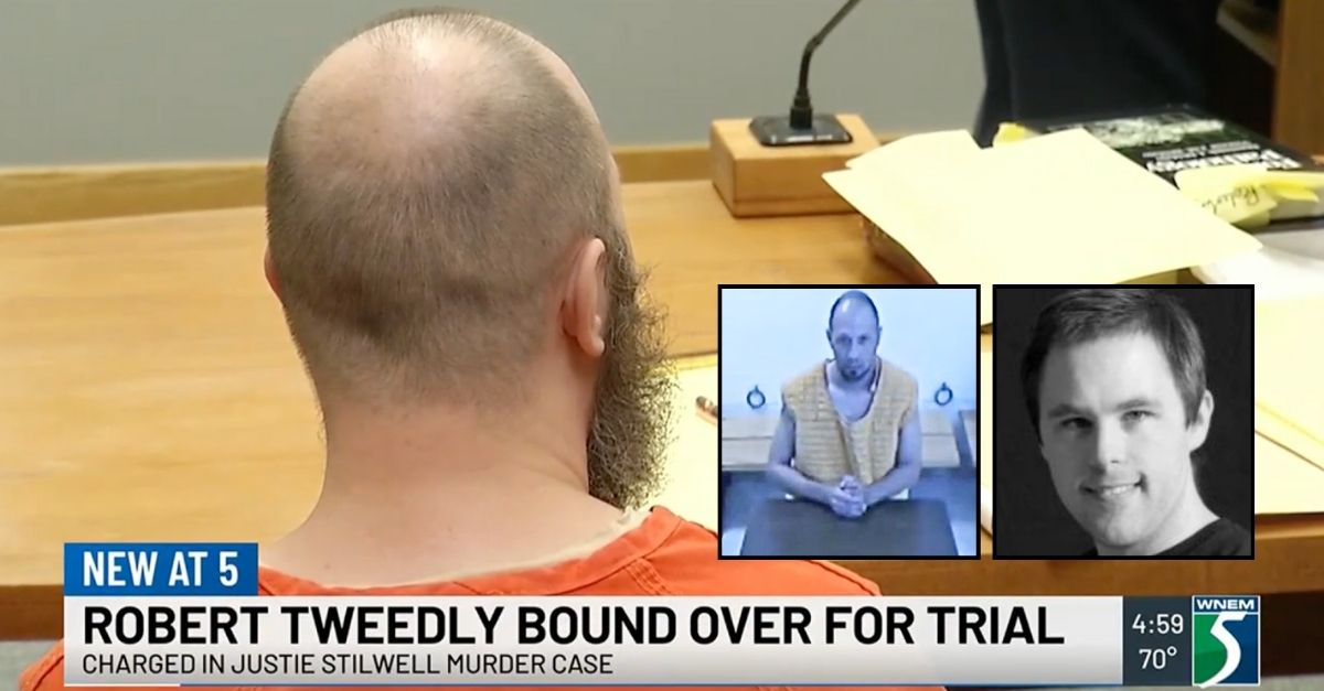 Background: Robert Tweedly Jr. in Bay County District Court during a preliminary hearing on Tuesday, Aug. 26, for the alleged strangling and dismemberment of Justie Stilwell last year (WNEM/YouTube). Left inset: Robert Tweedly Jr. (WNEM/YouTube). Right inset: Justie Stilwell (Skorupski Family Funeral Home & Cremation Services).