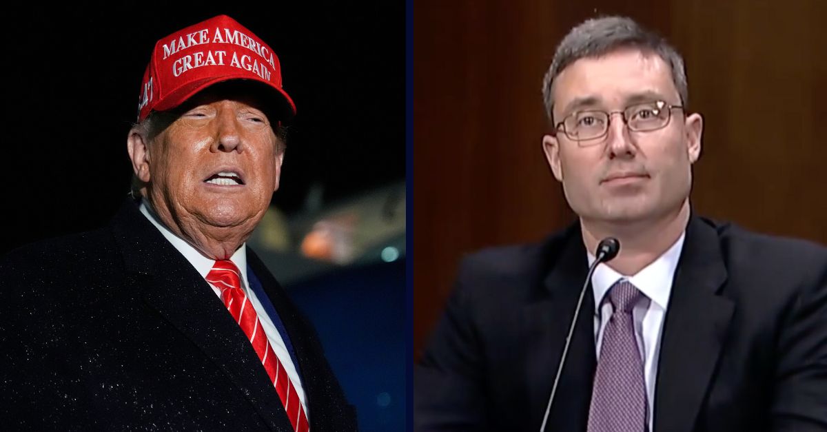 Left: President Donald Trump speaks to reporters in the rain after arriving on Air Force One at Joint Base Andrews, Md., Friday, May 30, 2025 (AP Photo/Julia Demaree Nikhinson). Right: U.S. District Judge Brian Murphy of the District of Massachusetts in April, 2024 (Instagram/Senate Judiciary Democrats)