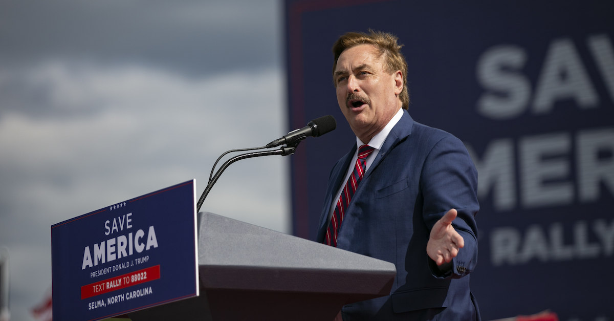 Mike Lindell speaks before a rally for Donald Trump at The Farm at 95 on April 9, 2022 in Selma, North Carolina (Photo by Allison Joyce/Getty Images).