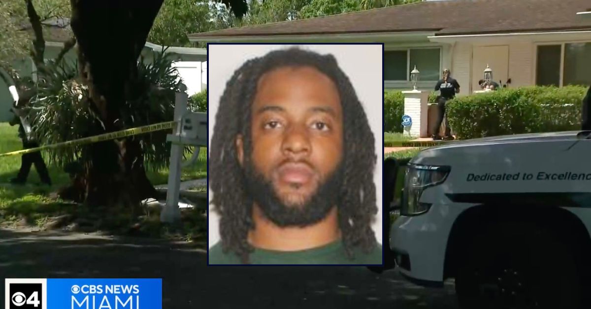 Inset: Isaiah Collins (Pembroke Pines Police). Background: Authorities at the Florida home where Collins allegedly killed a man and a woman last week (WFOR).