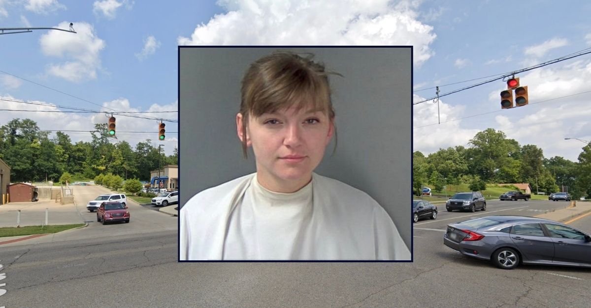 Inset: Ashley Gibson (Monroe County Jail). Background: The corner of E. 3rd Street in Bloomington, Indiana where Gibson was arrested (Google Maps).