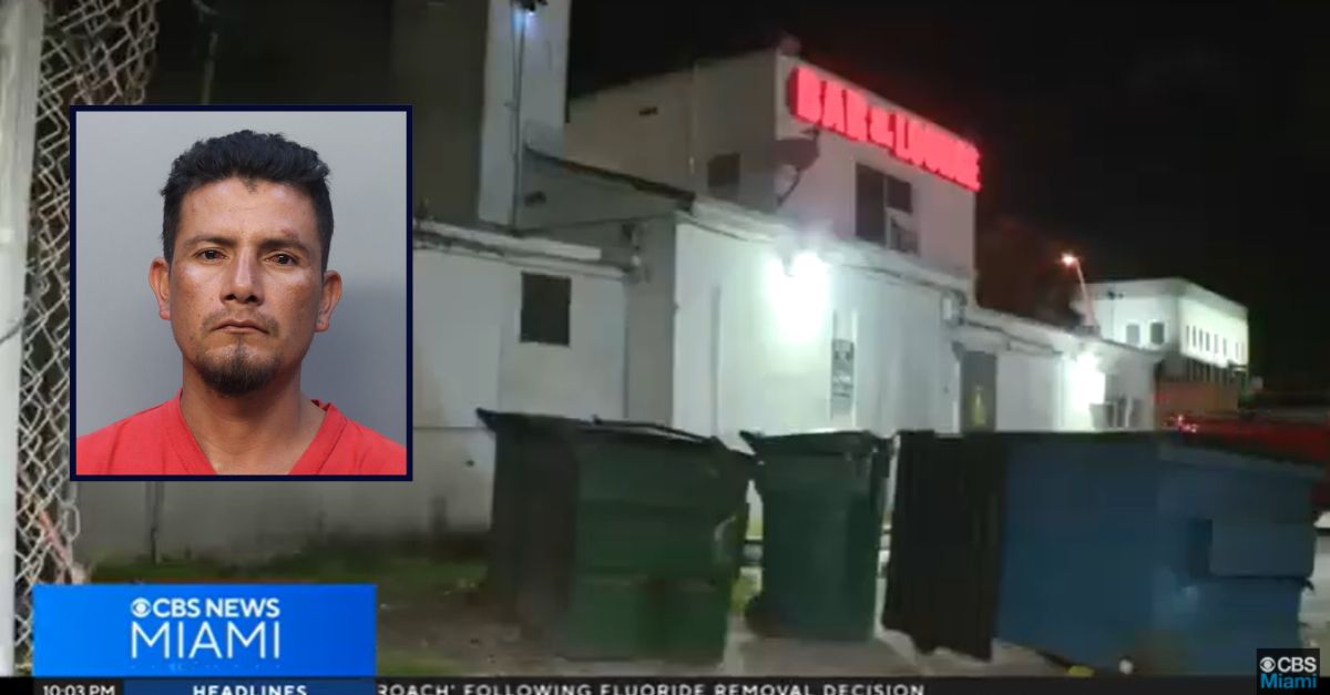 Inset: Oscar Rivera-Peraza (Miami-Dade Corrections and Rehabilitation). Background: The Miami bar where workers found a body in an outside freezer (WFOR/YouTube).