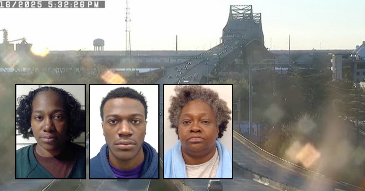 Insets: Coshelia Conley, Da’Sean Conley and Cathy Conley (East Baton Rouge Sheriff’s Office). Background: Huey P. Long Bridge in Jefferson Parish, Louisiana (WAFB/YouTube).