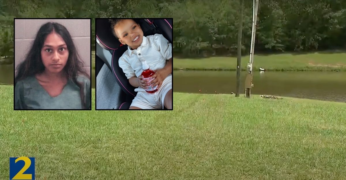 Inset left : Nafeeza Samad (Spalding County Sheriff”s Office). Inset right: Toddler identified as Hailey (GoFundMe). Background: Dundee Lake in Spalding County, Georgia (WSB/YouTube).
