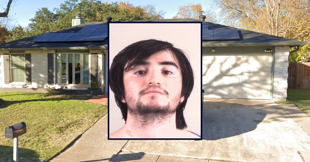 Inset: Alexander Taylor Valdez (Tarrant County Jail). Background: Fort Worth, Texas, home where Valdez allegedly killed his mother during an exorcism (Google Maps).