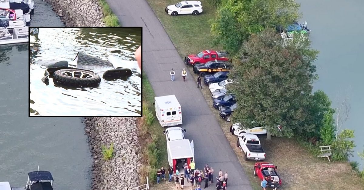 Background: The boat dock at Atwood Lake in Tuscarawas County, Ohio, where a woman allegedly drowned her 4-year-old son after causing her husband’s death, cops say (WKYC/YouTube). Inset: Remnants of the golf cart that Ohio authorities found after Vincen Miller’s mother allegedly crashed it with her three teenage children on board following Vincen’s drowning death, cops say (Tuscarawas County Sheriff’s Office).