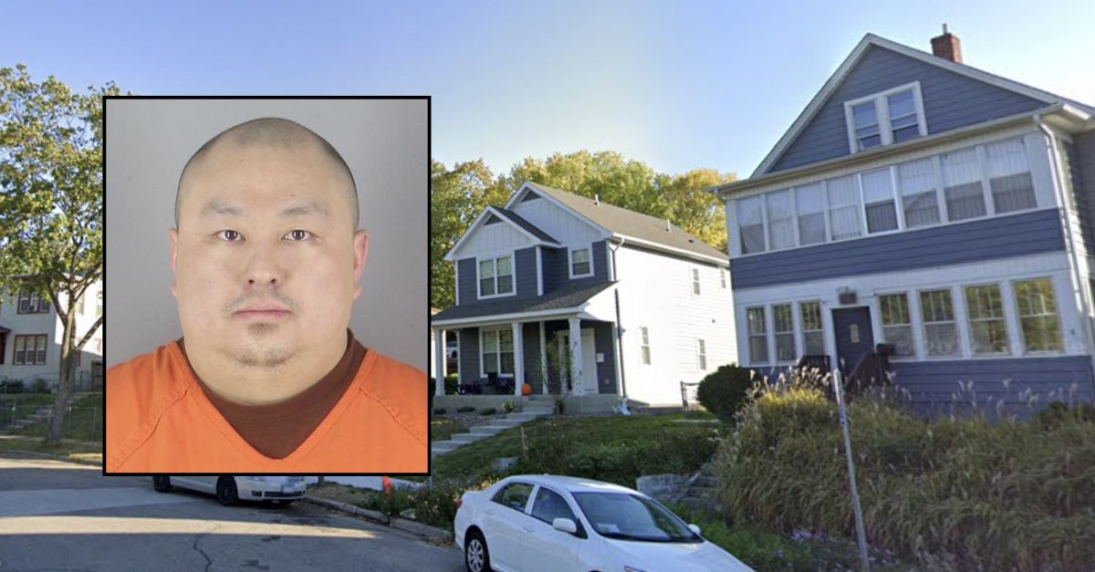 Background: The neighborhood on N. Irving Avenue in Minneapolis, Minn., where Lue Xiong allegedly set his house on fire (Google Maps). Inset: Lue Xiong (Hennepin County Sheriff’s Office).