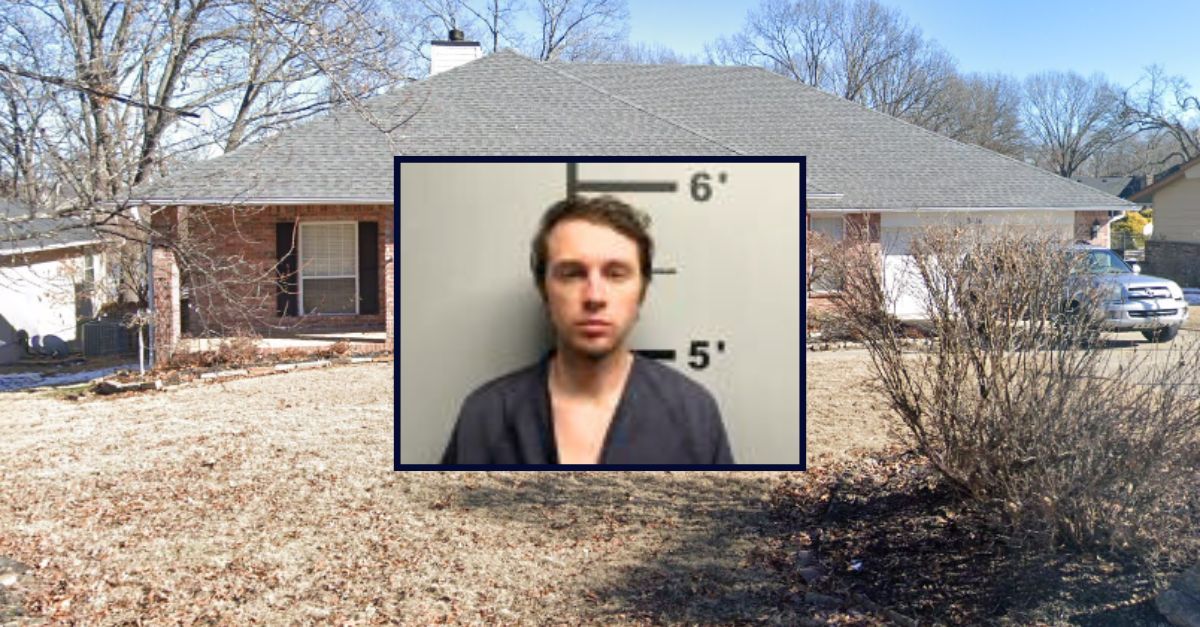 Inset: Joseph Alexander (Benton County Jail). Background: Home in Bentonville, Arkansas, where Alexander allegedly shot his mom with a crossbow (Google Maps).