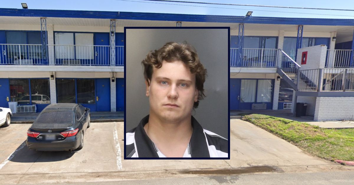Inset: Tristian Thomas (McLennan County Jail). Background: Motel in Bellmead, Texas, where Thomas allegedly beat up a man (Google Maps).
