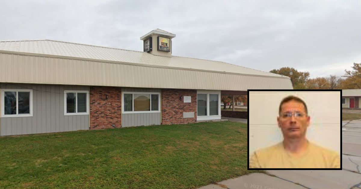 Inset: Roger Lee Abramson (York County Jail). Background: Sun Motel in Henderson, Nebraska (Google Maps).