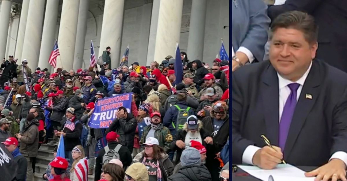 Left: Jan. 6 rioters during the 2021 Capitol attack (Department of Justice). Right: Illinois Gov. J.B. Pritzker signs a bill, Monday, June 12, 2023, at Harold Washington Library’s Thomas Hughes Children’s Library in downtown Chicago (State of Illinois via AP).