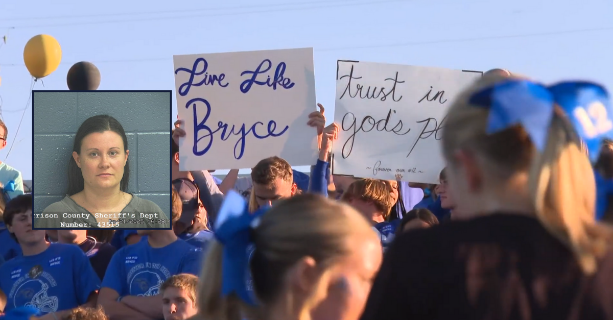 Inset: Amber Tower (Harrison County Sheriff’s Department). Background: Students remember Bryce Gerlach at a football game at Corydon Central High School (WHAS).
