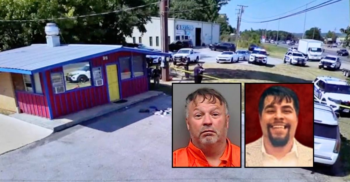 Left inset: Scotty Goble (Smith County Sheriff’s Office). Right inset: Heriberto “Eddie” Ramirez Jr. (All Families Memorial Services). Background: The scene outside Junior’s Taqueria in Tyler, Texas, after Scotty Hoble shot and killed co-owner Heriberto “Eddie” Ramirez Jr. in the parking lot in October 2024 (KLTV).