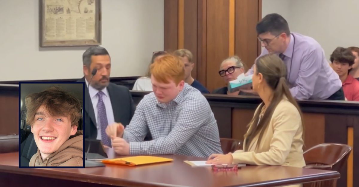 Inset: Ethan Riley (Jeter Memorial Funeral Home). Background: Connor Hilton during his sentencing for murdering Riley in 2023 (KHOU).