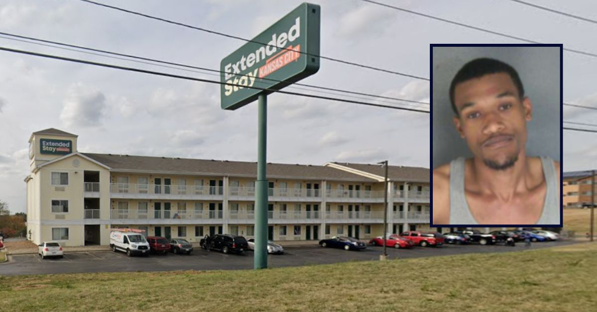 Inset: Jason Sessoms (Van Buren County Correctional Facility). Background: Extended Stay motel in Kansas City, Missouri, where Sessoms allegedly murdered his parents (Google Maps).