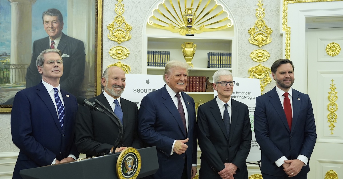 From left, Treasury Secretary Scott Bessent, Commerce Secretary Howard Lutnick, President Donald Trump, Apple CEO Tim Cook and Vice President JD Vance, pose for a photo after President Trump made an announcement about Apple, in the Oval Office, Wednesday, Aug. 6, 2025, in Washington. (AP Photo/Alex Brandon)