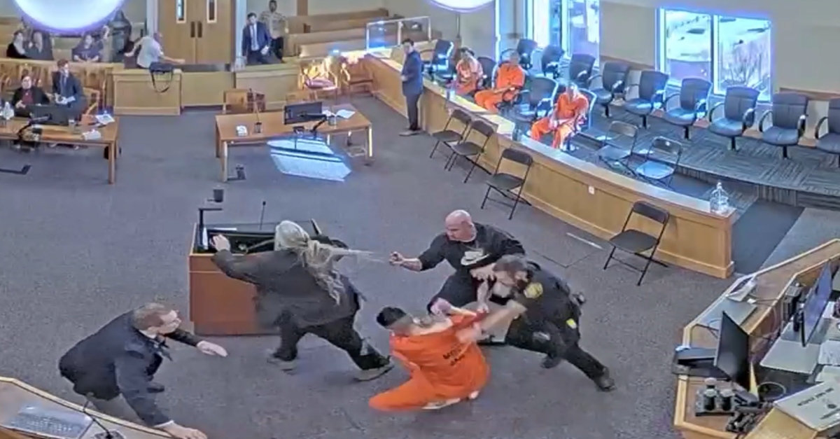 Surveillance footage shows two men rushing up to a murder defendant in the middle of an Albuquerque court on Friday. It quickly devolved into a chaotic brawl.