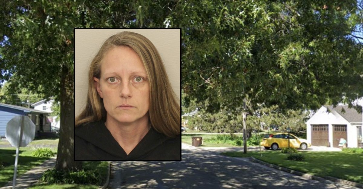 Background: The Oregon, Ill. neighborhood where Martha Dunham allegedly assaulted a child (Google Maps). Inset: Martha Dunham (Ogle County Sheriff’s Office).