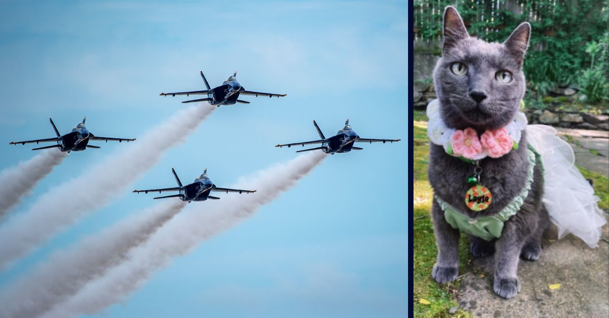 Left: Blue Angels perform in 2023 (U.S. Navy). Right: Layla the cat (Lauren Ann Lombardi).