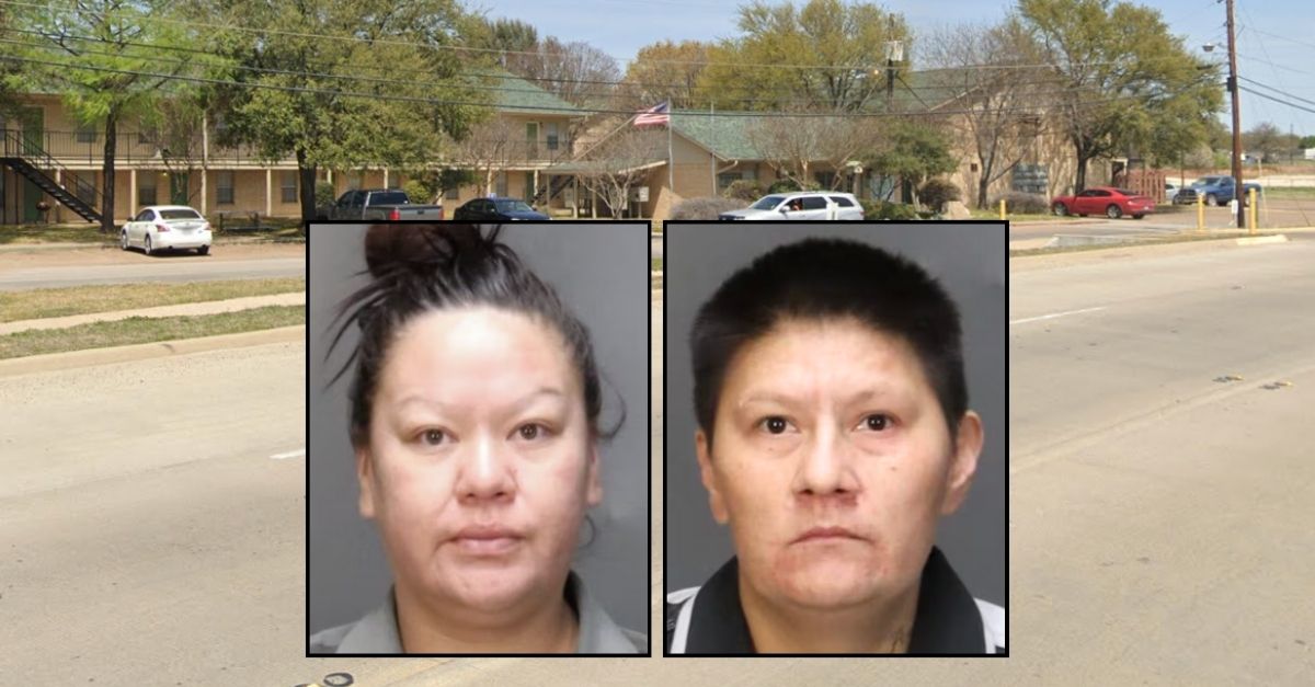 Insets, left to right: Leah Breuer and Joann Cometsevah (McLennan County Jail). Background: The Village Square Apartments in McLennan County where David Peeler was murdered (Google Maps).