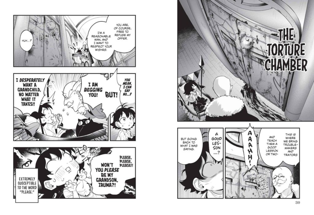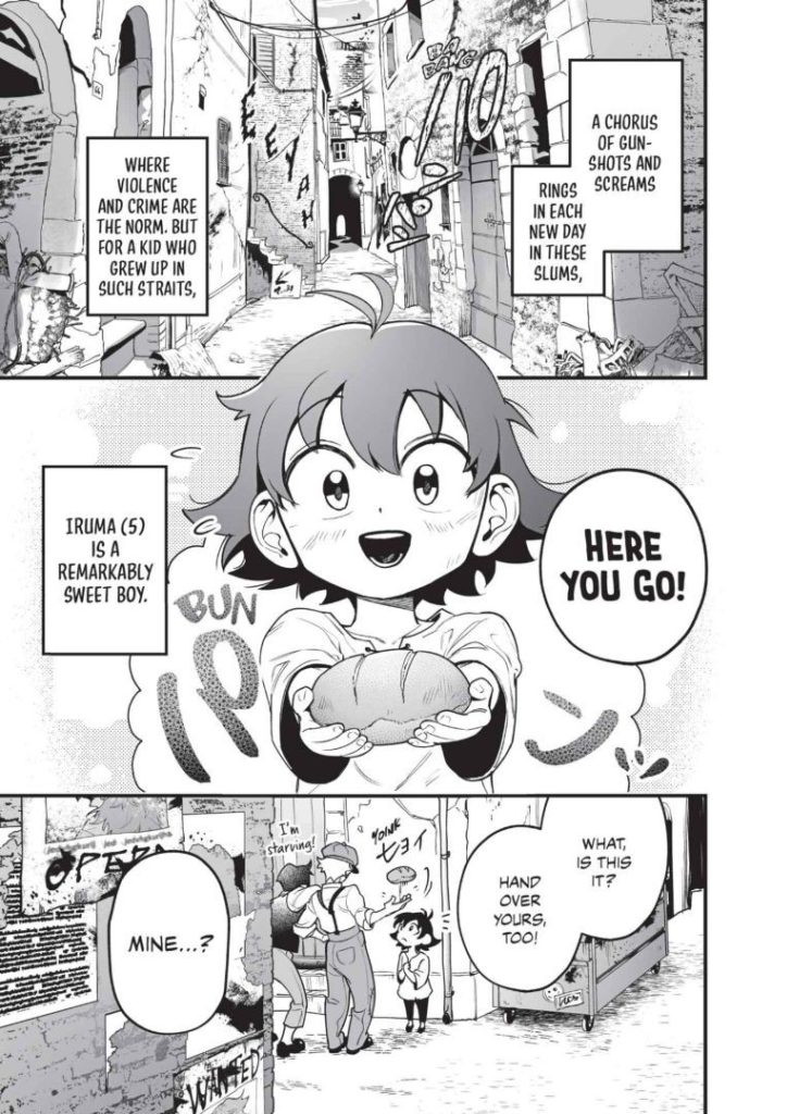 Little Iruma has been born into a life of poverty in the slums but has a kindly heart which others constantly take advantage of. ‘Unfailingly accepting by nature, he is incapable of saying no’. When he finds an old man lying in a pool of blood outside the tent he calls home, his first thought is to try to nurse him back to health, even giving him his last loaf of bread. Little does he expect that, a few days later, the old man will reappear and introduce himself as Don Sullivan, head of the Babel Mafia. Whisked away to the Babel HQ, Iruma fears that he’s been kidnapped – but no, “You can call me Nonno!” says Don Sulllivan, beaming indulgently. “Because as of today, you are my grandson!”