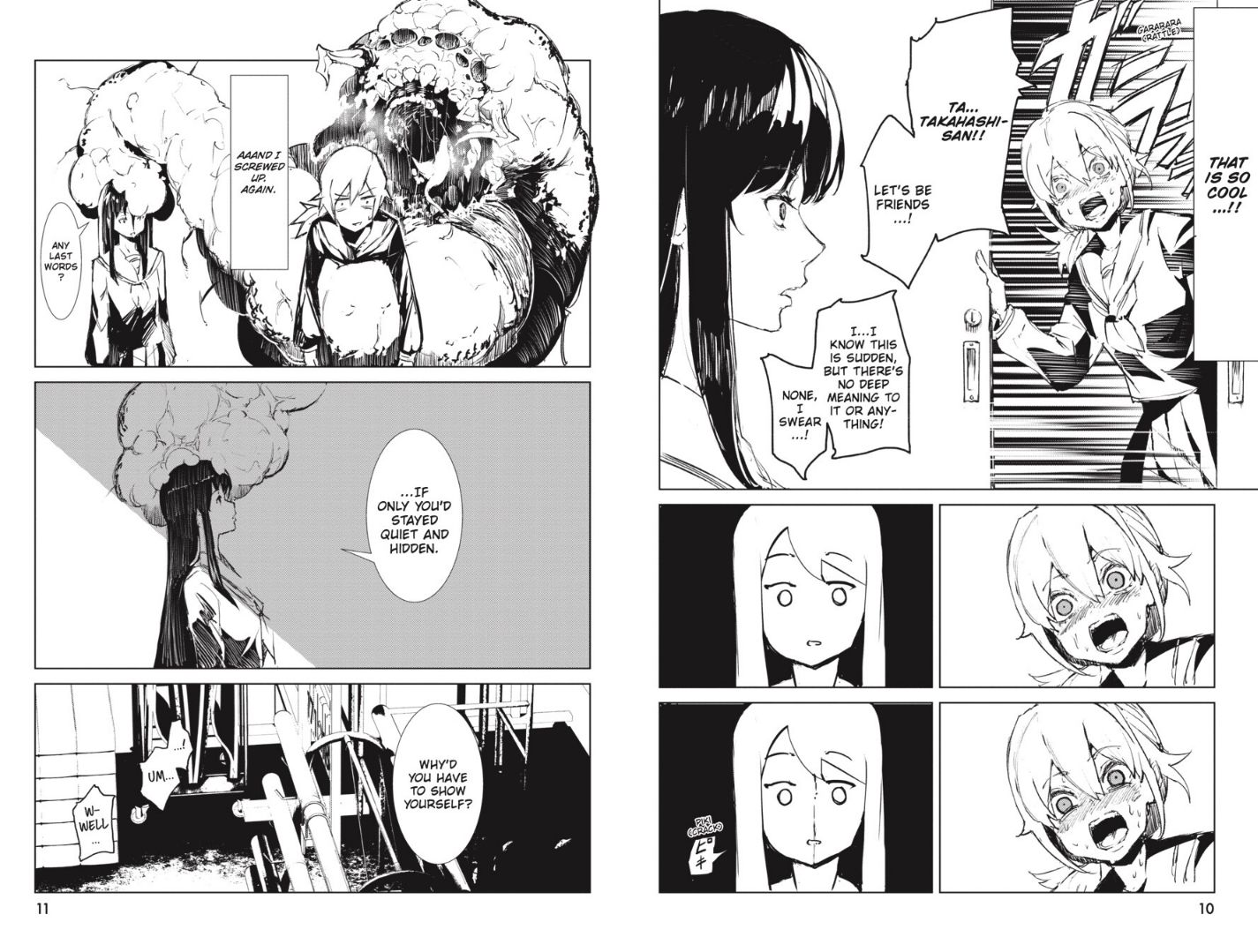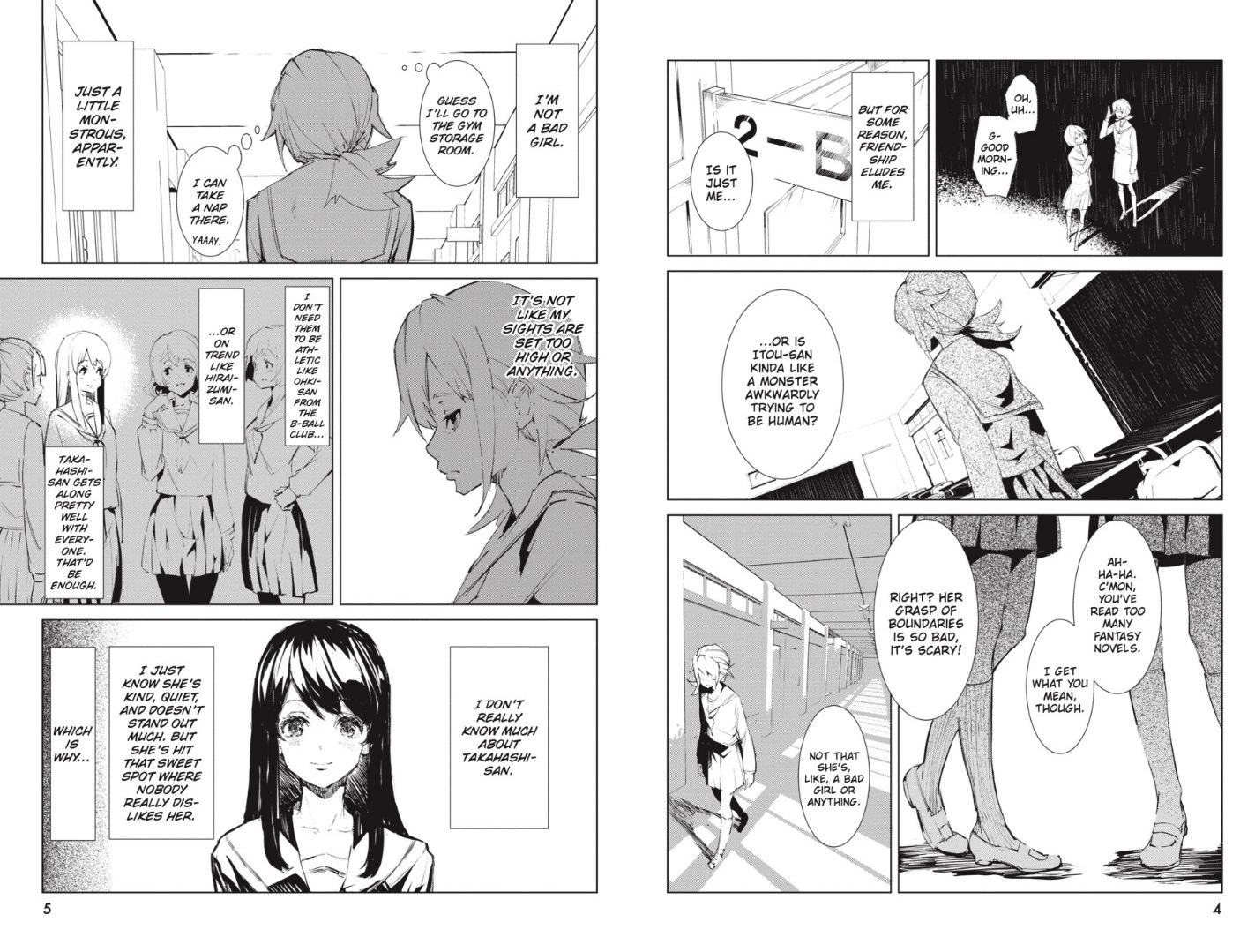 Itou just wants to be normal; she wants to have friends, she wants to talk like a regular high school girl, and she wants to have the genuine ‘high school’ experience, but her awkwardness and off-beat tastes keep her an outsider at her school. She really looks up to Takahashi, a girl in her class whom everyone likes. However one day Itou decides to take a nap in the gym, and ends up encountering Takahashi EATING one of their teachers. Takahashi is a monster in human form, using a student’s skin to pass off as ordinary in order to eat humans. Itou isn’t scared though, she’s elated! Because if a monster like Takahashi can pass off as ‘normal’, then maybe she can teach Itou! Reluctantly, Takahashi agrees to help Itou be normal, but what’s in it for the monster? Does she have something else up her sleeve?