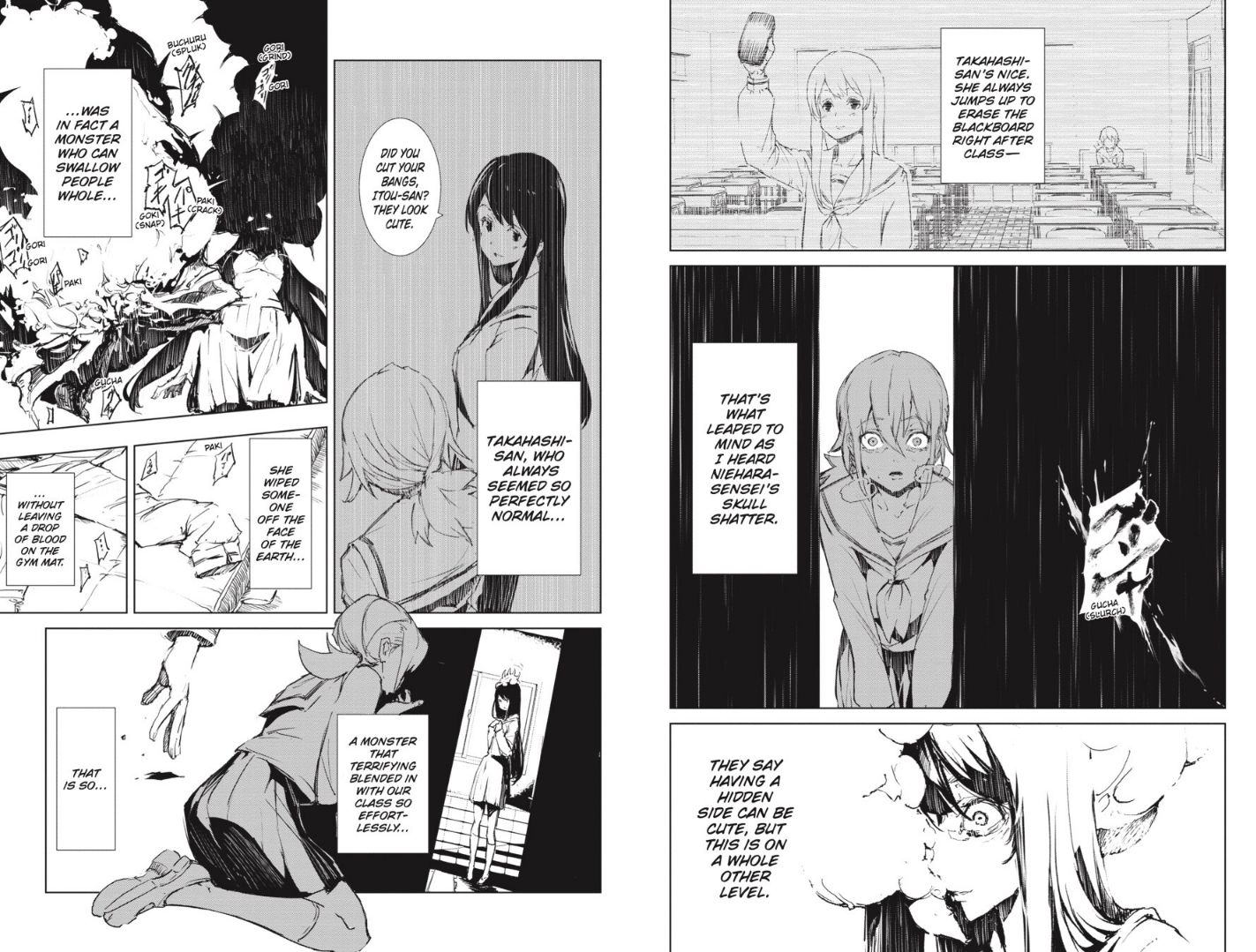 Then we have the monster herself, Takahashi. She’s closer to the likes of the eldritch creature in The Summer Hikaru Died, in that she takes the form of another student she previously ate (as she puts it, wearing her shell) to pass off as human, but her true form is larger, more demonic and terrifying that anything you’ve seen before. But personality-wise, she’s far more cold and reserved, closer to the likes of H.P. Lovecraft’s eldritch creations in that she’s so far removed from humanity that she doesn’t care about Itou’s feelings. She has no need to grow close to her, the opposite to Hikaru (The Summer Hikaru Died) or Shiori (This Monster Wants to Eat Me) who both feel inclined to get closer to their protagonists. Takahashi can pass off as ‘normal’ because she is very intelligent, observing humans to the point where she can blend in without hassle. This makes her more dangerous because if she can also easily lie about what she likes and pass off as human, it means she can just as easily switch and turn on her monstrous form quicker than you can blink. So in every chapter there’s always a threat of danger, regardless of her being in human or monster form, and Itou being oblivious to it most of the time makes the sense of tension and fear very strong throughout.