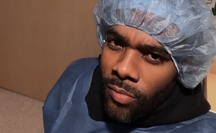 The snapshot shows the singer clad in blue scrubs, commemorating the birth of his little one.