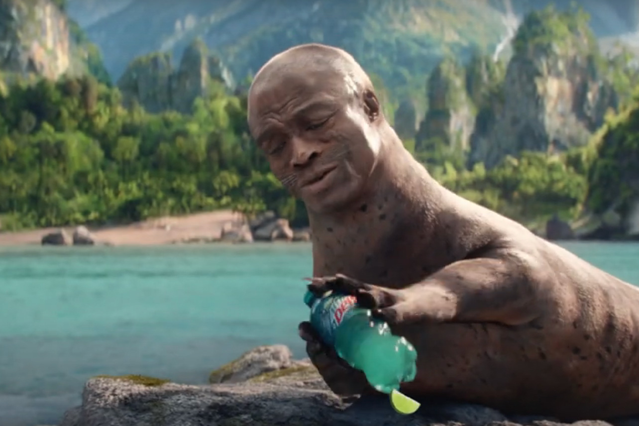 There, she’s told the beverage is “kissed by the perfect amount of tropical lime,” when all of a sudden, the opening notes of “Kiss From A Rose” play and we see Seal sunning himself on a rock with a bunch of other seals, where he sings about Baja Blast Mountain Dew and how sad he is not to be able to hold onto it with flippers.