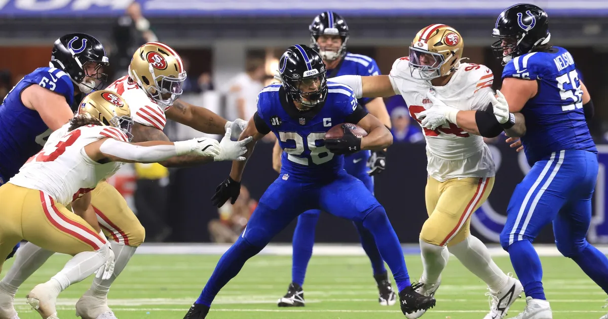 Jonathan Taylor #28 of the Indianapolis Colts rushes for yards during the fourth quarter of the game against the San Francisco 49ers Getty Images