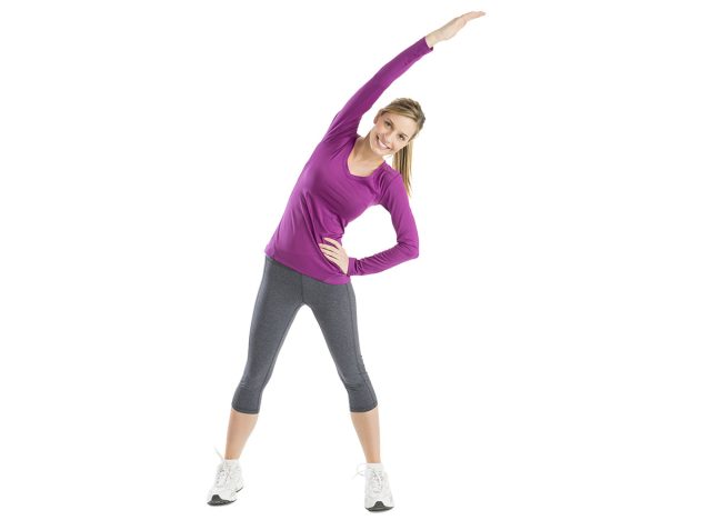 • Start with arms overhead to one side, then pull diagonally down across your body toward your opposite hip.