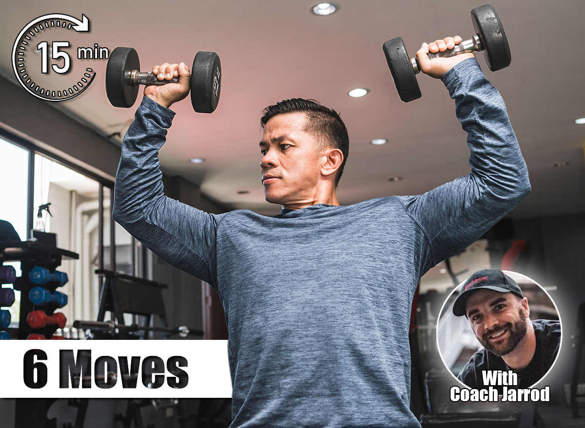 This move trains your body to generate force from the ground up, which is the foundation of everyday strength. It develops lower-body power while reinforcing core stability and shoulder strength. The overhead press portion also challenges mobility, making it a complete strength-builder that improves how you lift, carry, and move in daily life.