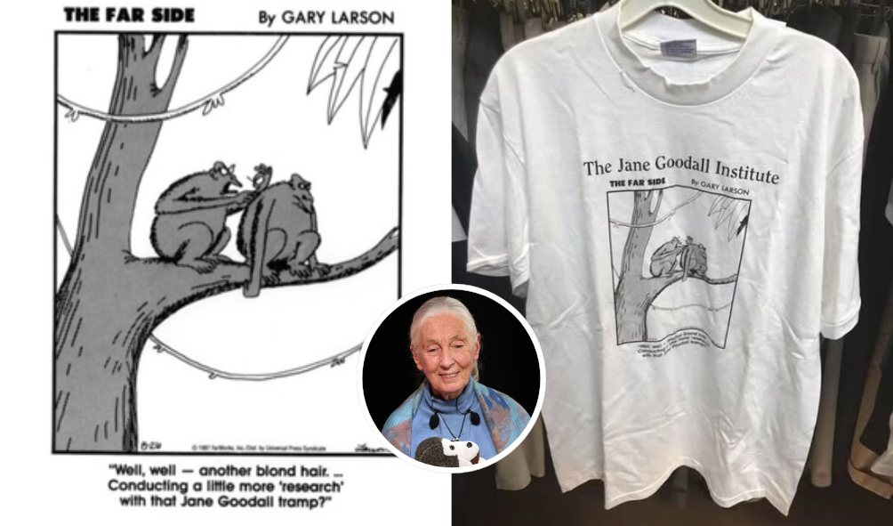 Dr. Goodall used Gary Larson's comic strip on her institute's fundraising t-shirts. (Image via X)