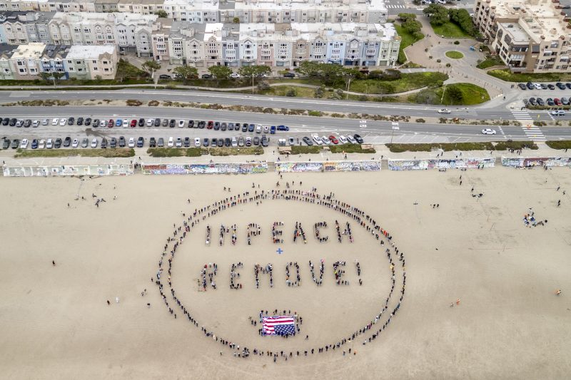 Thousands of people also marched through downtown Portland, Oregon, while in San Francisco, hundreds spelled out the words “Impeach & Remove” on a sandy beach along the Pacific Ocean, also with an inverted U.S. flag.