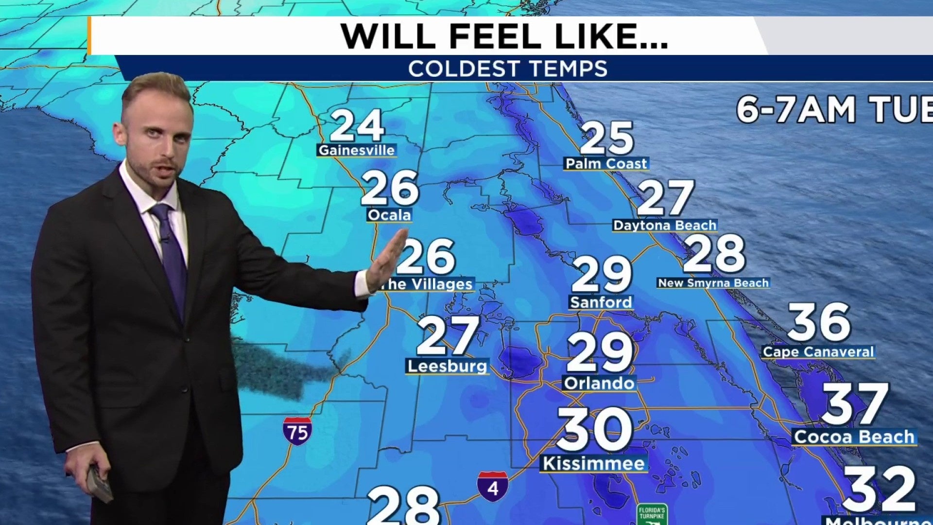 You put these two variables together, and what it’ll feel like to us is WELL below freezing. Some of the feels-like temps for Gainesville, Ocala, The Villages, and areas further northwest you go bottom out at about 23-25 degrees.