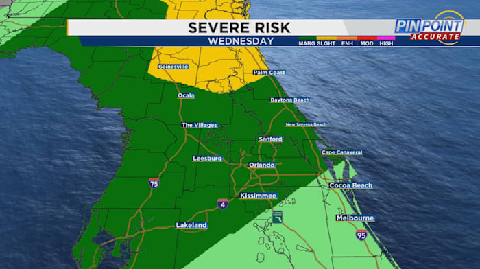 The counties under this more widespread and general risk for powerful storms include: Alachua, Marion, Putnam and Flagler counties. A level 2 out of 5 risk area increases your odds of seeing damaging weather activity in your neighborhood. Basically, more than just one or two severe warned cells.