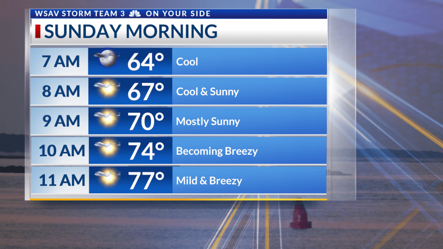 Sunday morning will start off pleasant again with temperatures in the 60s, and mostly sunny skies. Winds will be out of the northeast and it will be breezy at times Sunday.