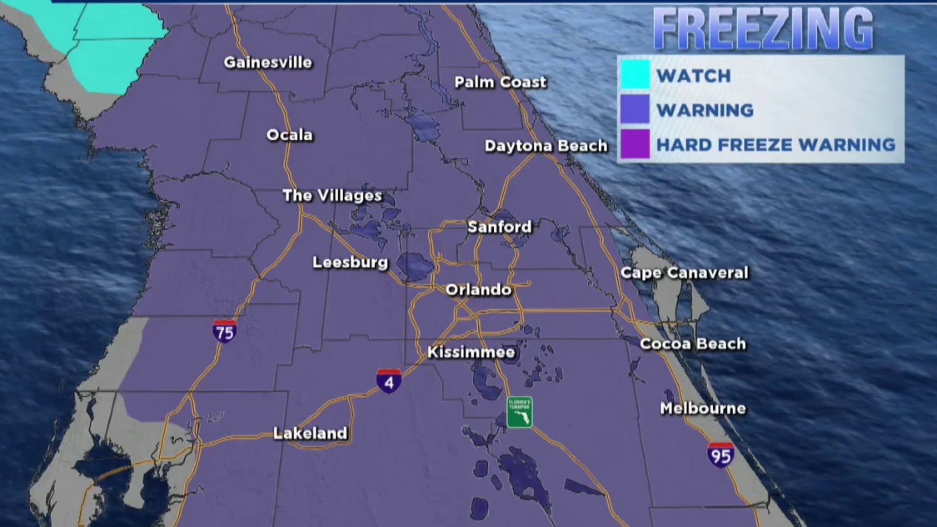 Cities northwest of I-4 could see a stretch of two-to-four hours at or just below freezing. Some of these areas include Ocala and Coleman.
