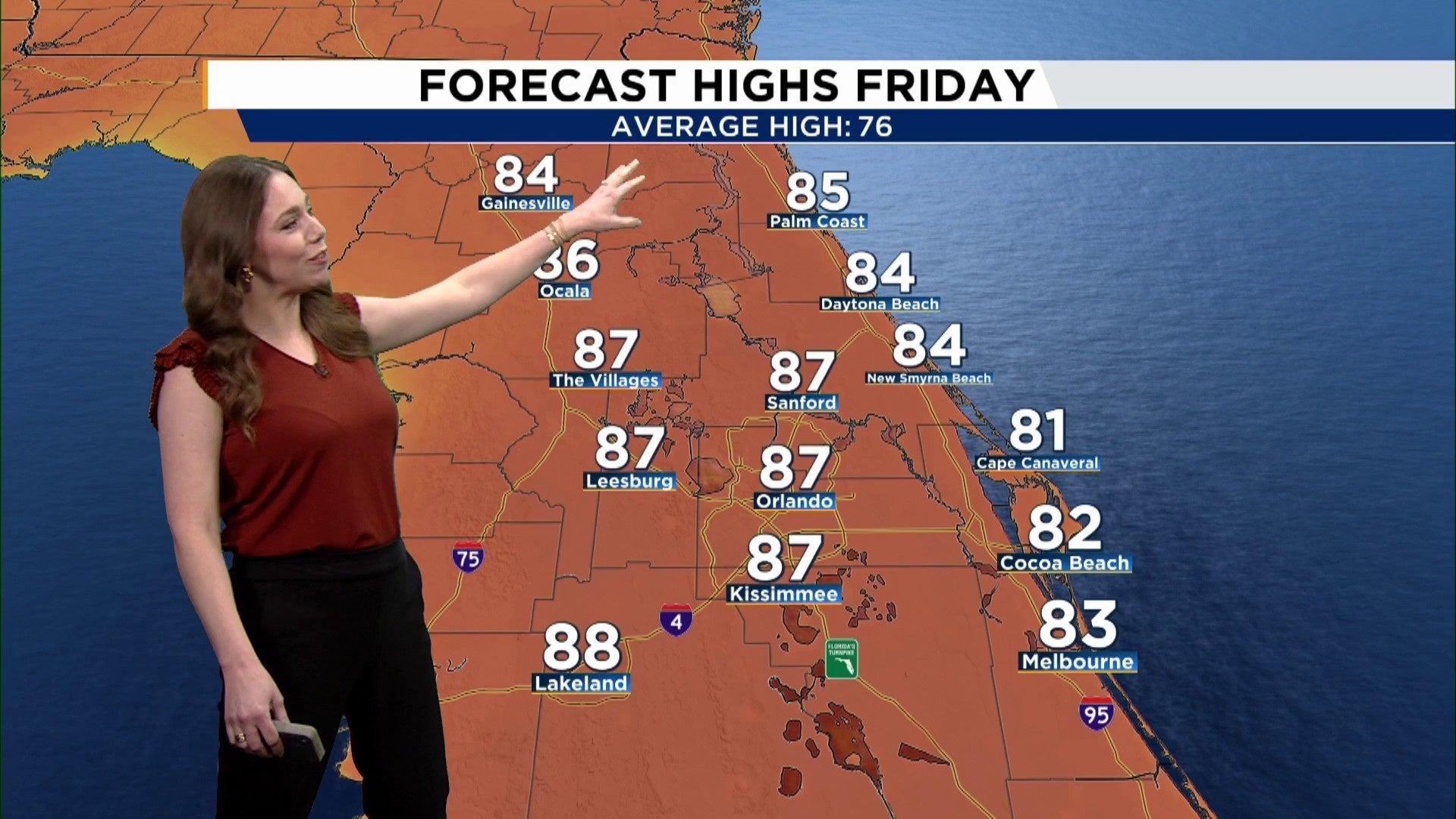 Saturday stays just as hot, if not hotter. Orlando is forecast to hit 88 degrees, setting the stage for Saturday to likely become the warmest day of the year so far.
