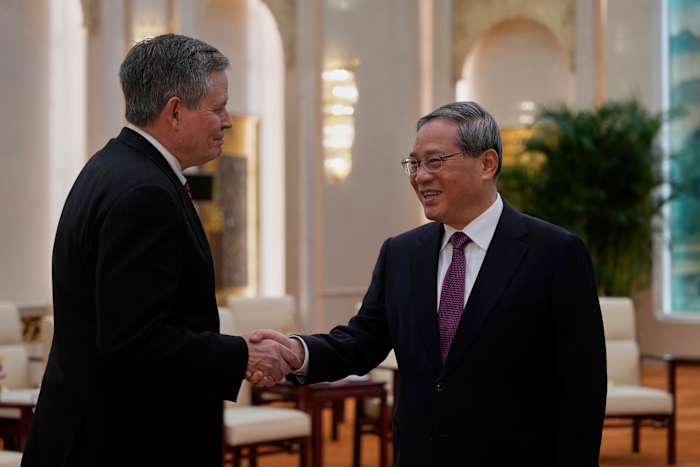 BEIJING – Chinese Premier Li Qiang said Sunday that Beijing and Washington should choose dialogue instead of confrontation during his meeting with U.S. Senator Steve Daines, a strong supporter of President Donald Trump, as the two countries are locked in rising friction over trade tariffs and efforts to combat illegal fentanyl trade.