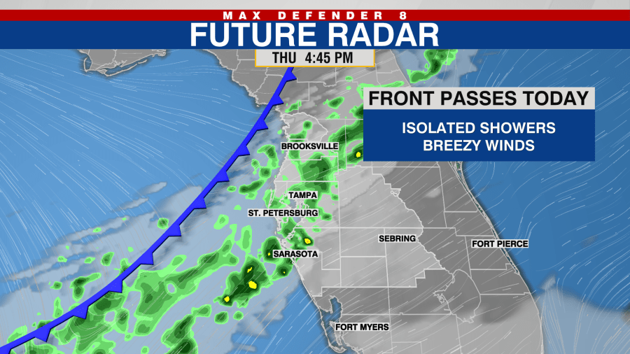 TAMPA, Fla. (WFLA) — A cold front will pass through the Tampa Bay area this afternoon on the first day of spring. It will bring a few isolated showers this afternoon and evening as it passes.